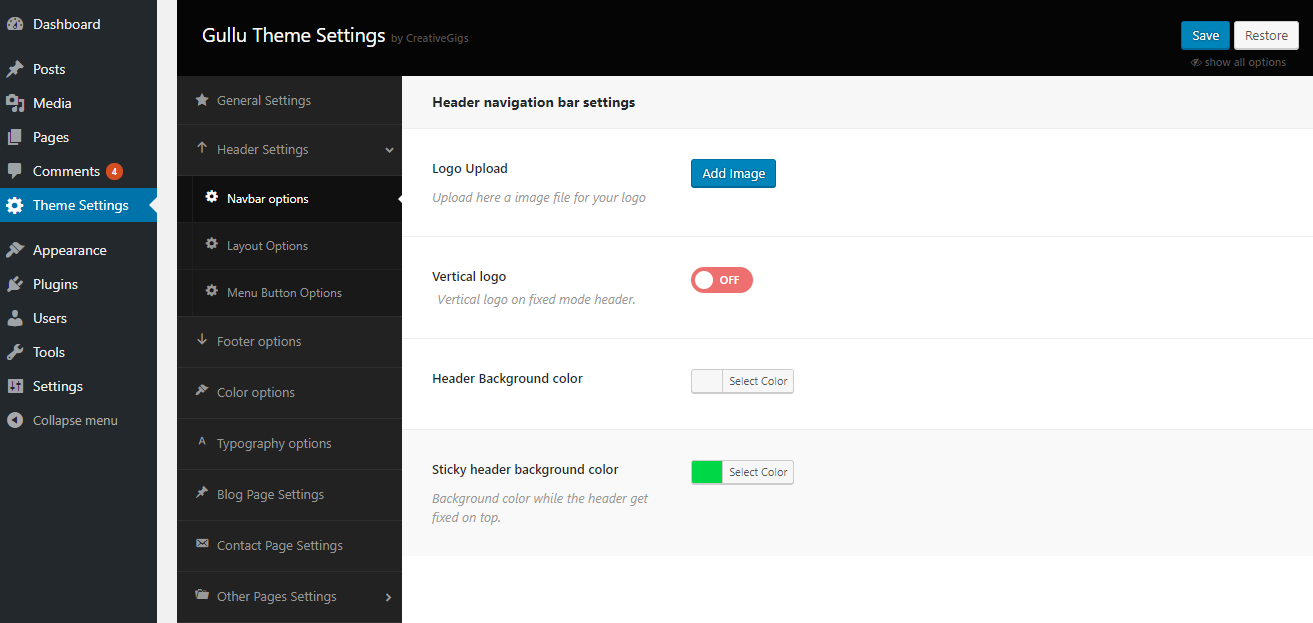 In the Header settings section, you will get a lot of header customization options. In this section, you can change the logo and set the menu button, navigation bar settings etc.